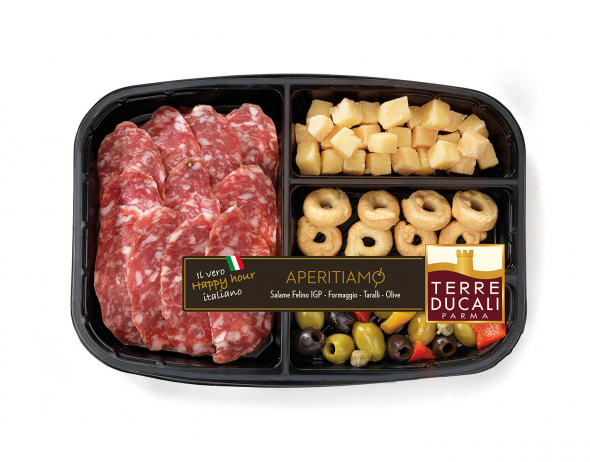 La nostra gamma si arricchisce! Un aperitivo stuzzicante e pratico! • Un vassoietto nero semplice ed elegante ideale da portare direttamente in tavola • Un contenuto 100% di specialità italiane: Salame Felino IGP, una specialità della salumeria emiliana - Formaggio italiano a media stagionatura - Olive miste nere e verdi italiane aromatizzate e condite - Taralli classici.
