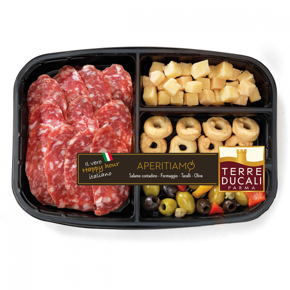 La nostra gamma si arricchisce! Un aperitivo stuzzicante e pratico! • Un vassoietto nero semplice ed elegante ideale da portare direttamente in tavola • Un contenuto 100% di specialità italiane: Il Salame contadino - Formaggio italiano a media stagionatura - Olive miste nere e verdi italiane aromatizzate e condite - Taralli classici.