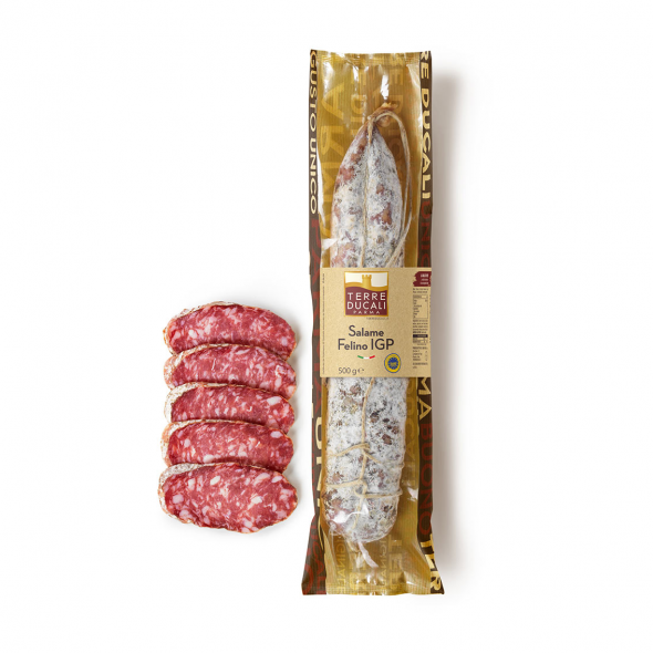 Il Salame Felino IGP è “il Salame”. Prodotto di antiche tradizioni, ma sempre attuale. Il nome "Felino" deriva dall'omonima cittadina dei colli parmensi in cui viene prodotto da almeno due secoli. Terre Ducali lo prepara utilizzando pura carne di coscia suina, accuratamente scelta, a cui si aggiungono, nella proporzione del 25-30%, parti grasse selezionate fra quelle a costituzione più dura. Durante la triturazione a pasta grossa vengono aggiunti sale e pepe in grani, mentre successivamente, poco prima dell'insacco, pepe e aglio, pestati e disciolti in vino bianco secco. Il budello è di tipo gentile, che gli conferisce il tipico aspetto al diametro non costante. La stagionatura, che dura alcuni mesi, fa si che si sviluppino le caratteristiche muffe bianco-grigio sul budello.